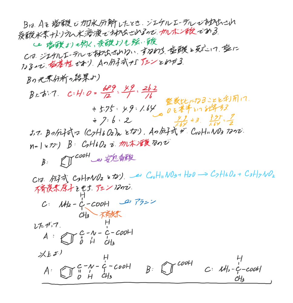 分子式C10H11NO3の化合物Aがある。化合物Aを塩酸と加熱し、加水分解させると2種類の化合物BとCが得られる。Bは反応水溶液からジエチルエーテルで抽出され、Bはこのジエチルエーテル溶液から炭酸水素ナトリウム水溶液で抽出される。又、Bは炭素、水素、酸素から構成され、元素分析の結果、C=68.9%、H=4.9%が得られた。Cは不斉炭素原子をもち、光学異性体が存在する。 以上からA,B,Cの構造式を記せ。 |